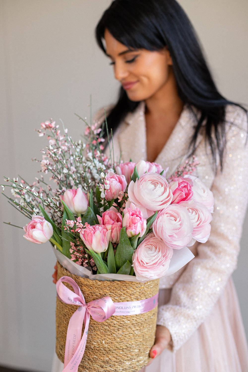 Sastāvs: 5 ranunkuļi, 20 tulpes, ginstera, grozs D17-D19 cm