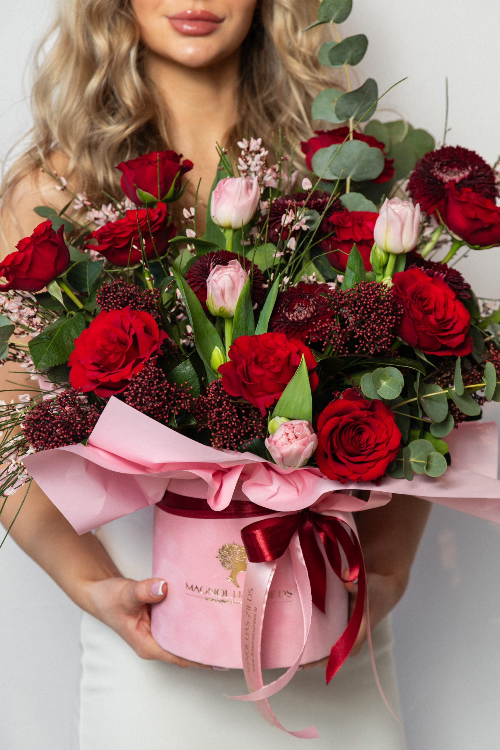 Sastāvs: 10 rozes, 10 mini gerberas, 5 tulpes, skimija, 0.5 ginstera, 0.5 zaļums