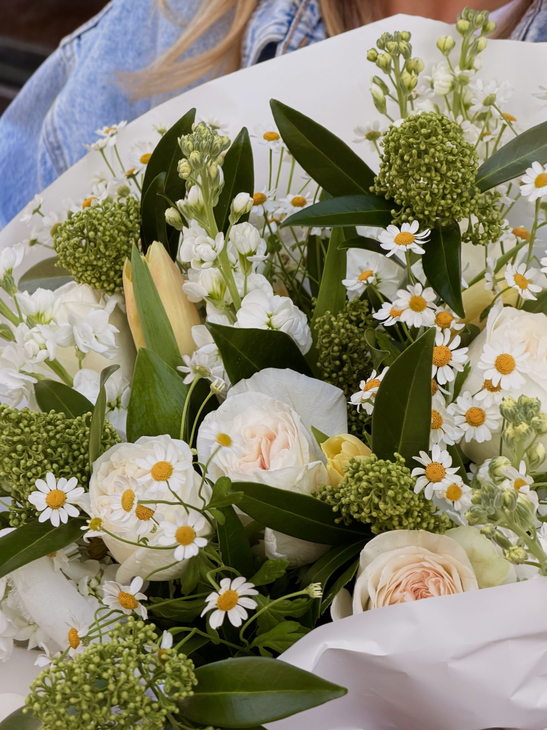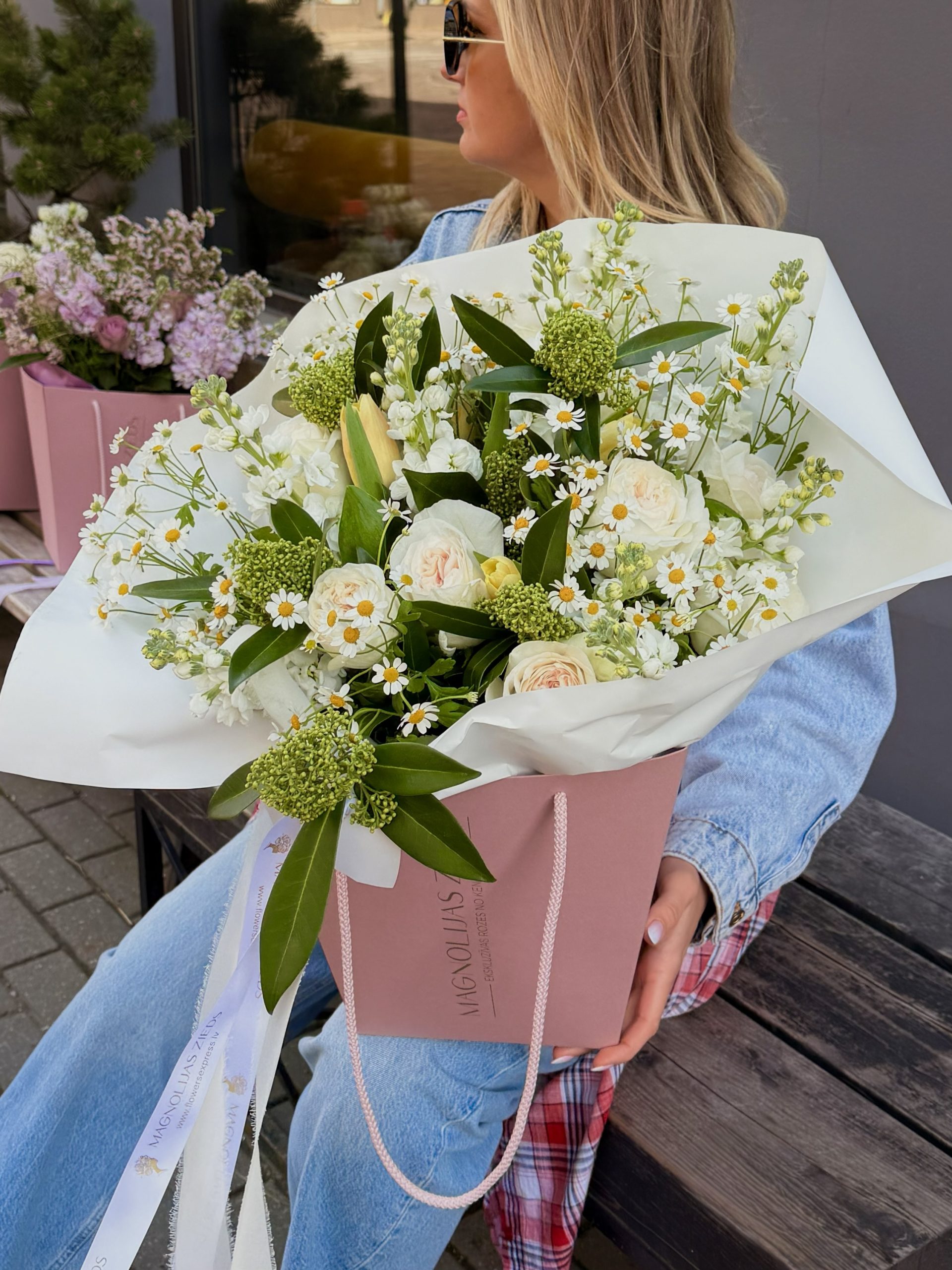 Sastāvs: 10 ohara rozes, 10 lefkojas, 5 tulpes, 5 kumelītes, bunte skimmija
