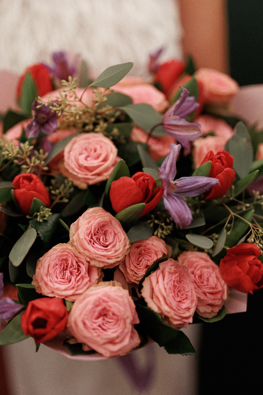 Sastāvs: 10 tulpes, 5 clematis, 5 krūmrozes, 0/5 mix zaļums