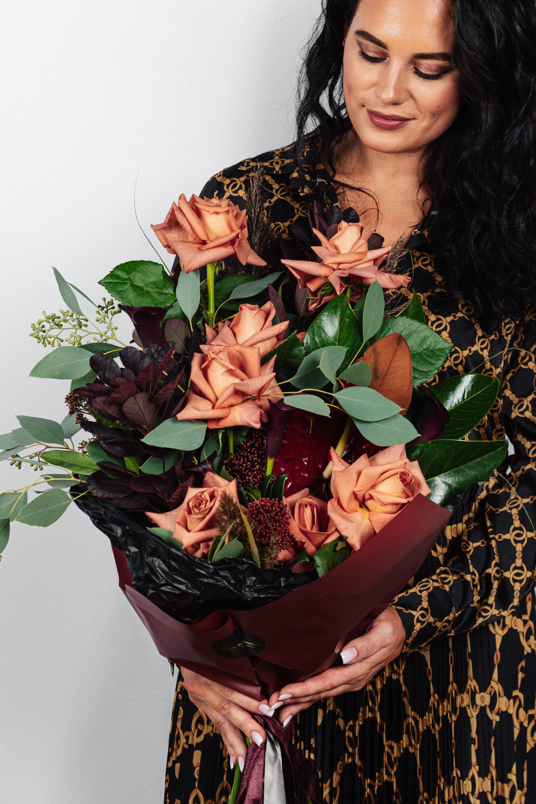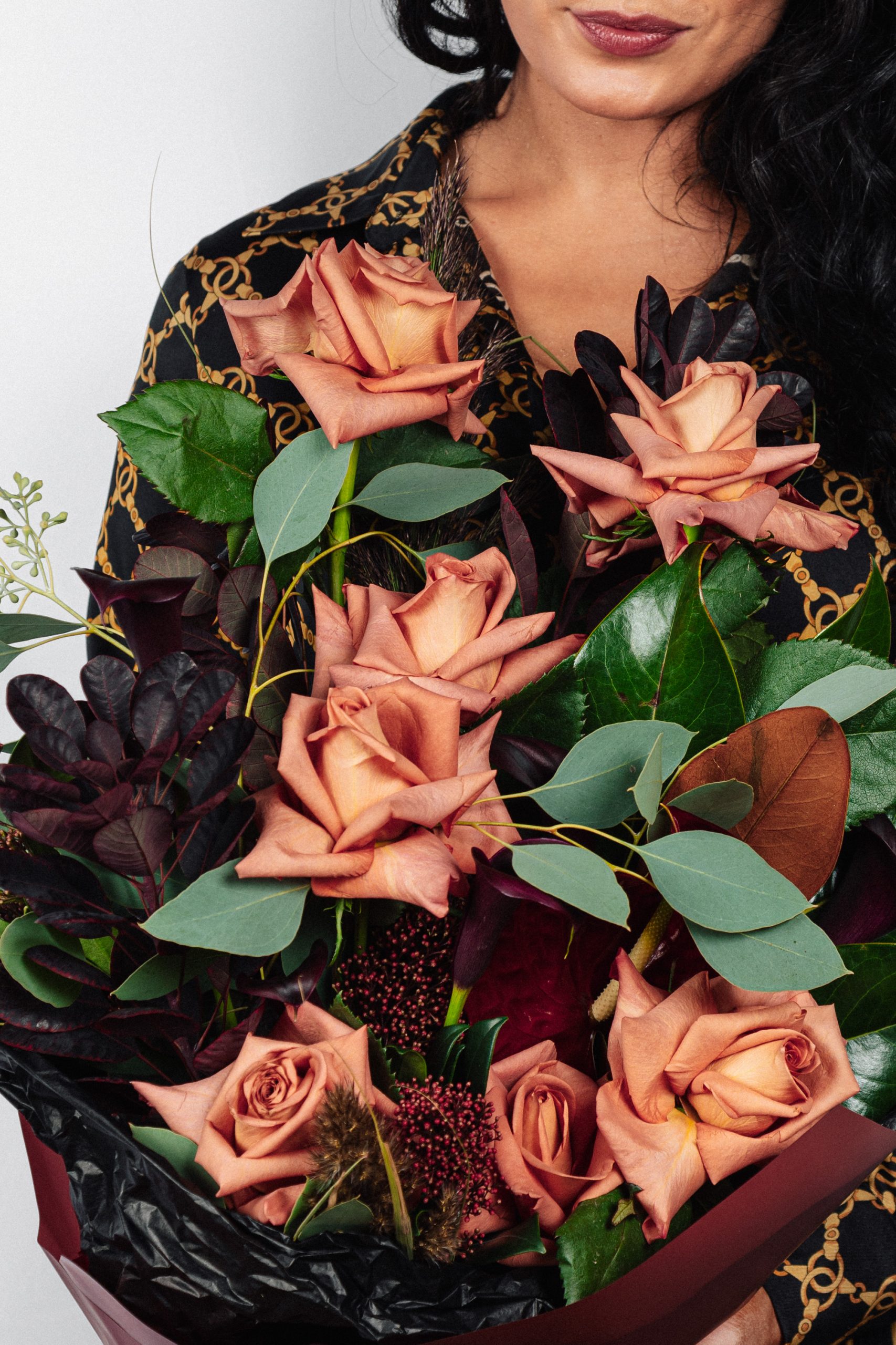 Sastāvs: 7 rozes, 1 antūrija, skimija, 5 cotinus, Magnolijas lapa, 5 smilgas, zaļums