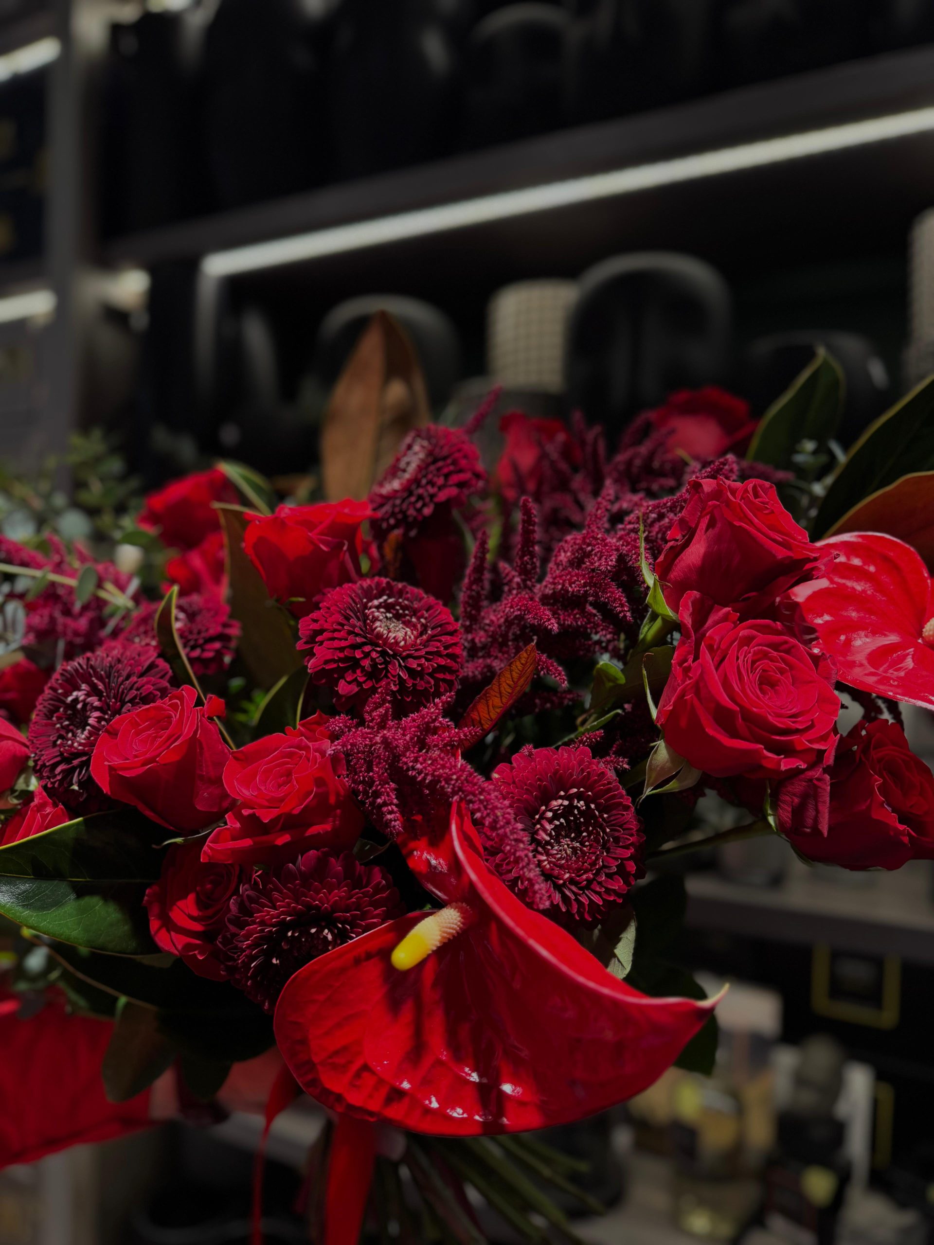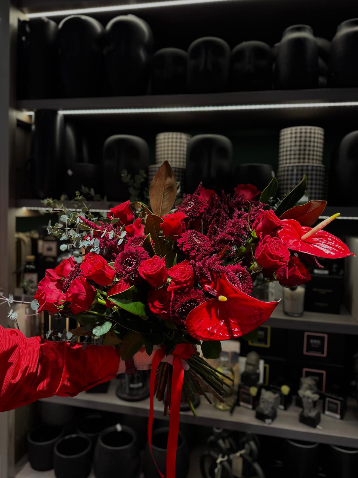25 Freedom rozes, 7 gerberas, 5 amaranti, 3 magnolijas lapas, 3 eikalipta zari, 3 antūrijas