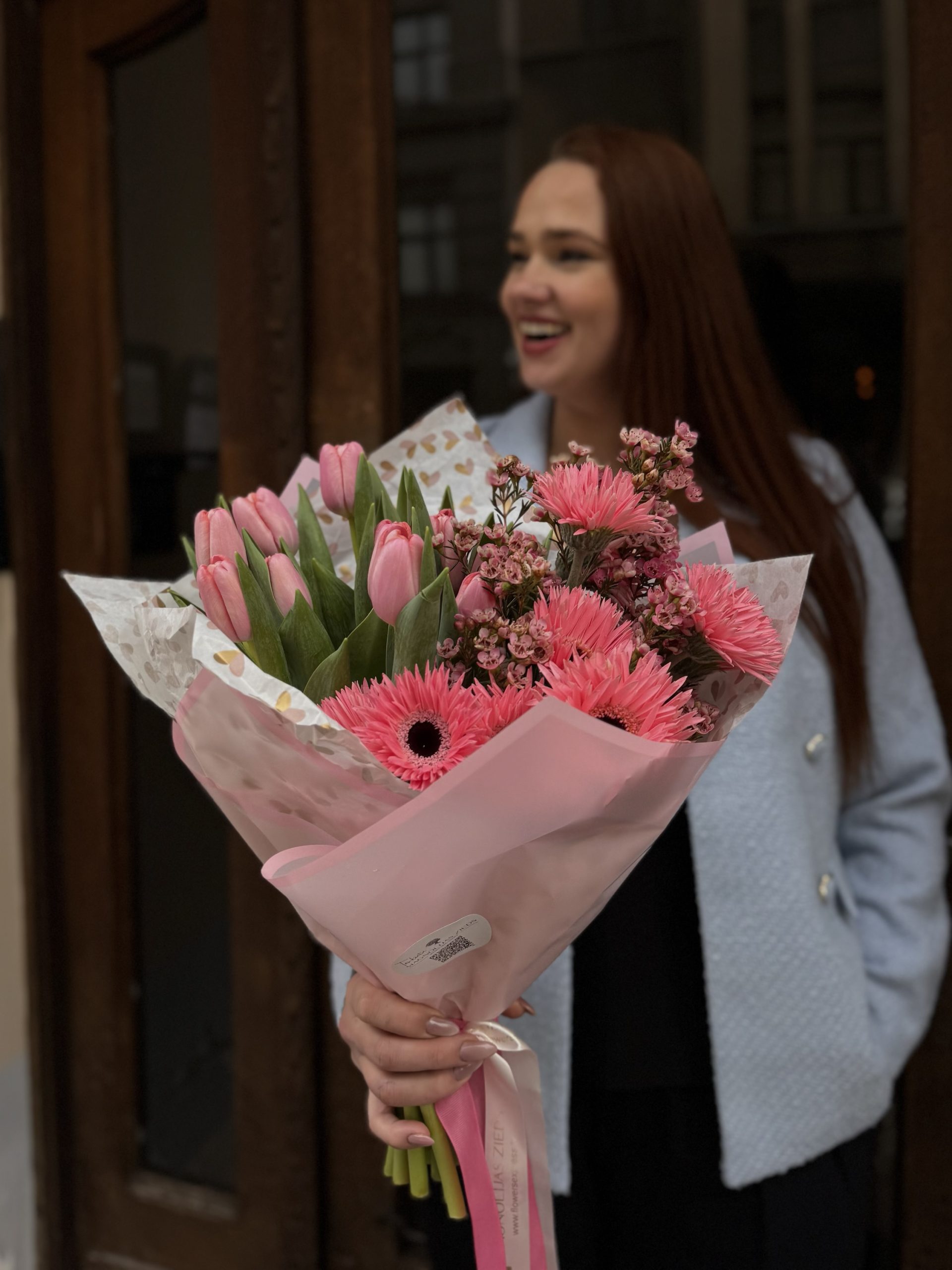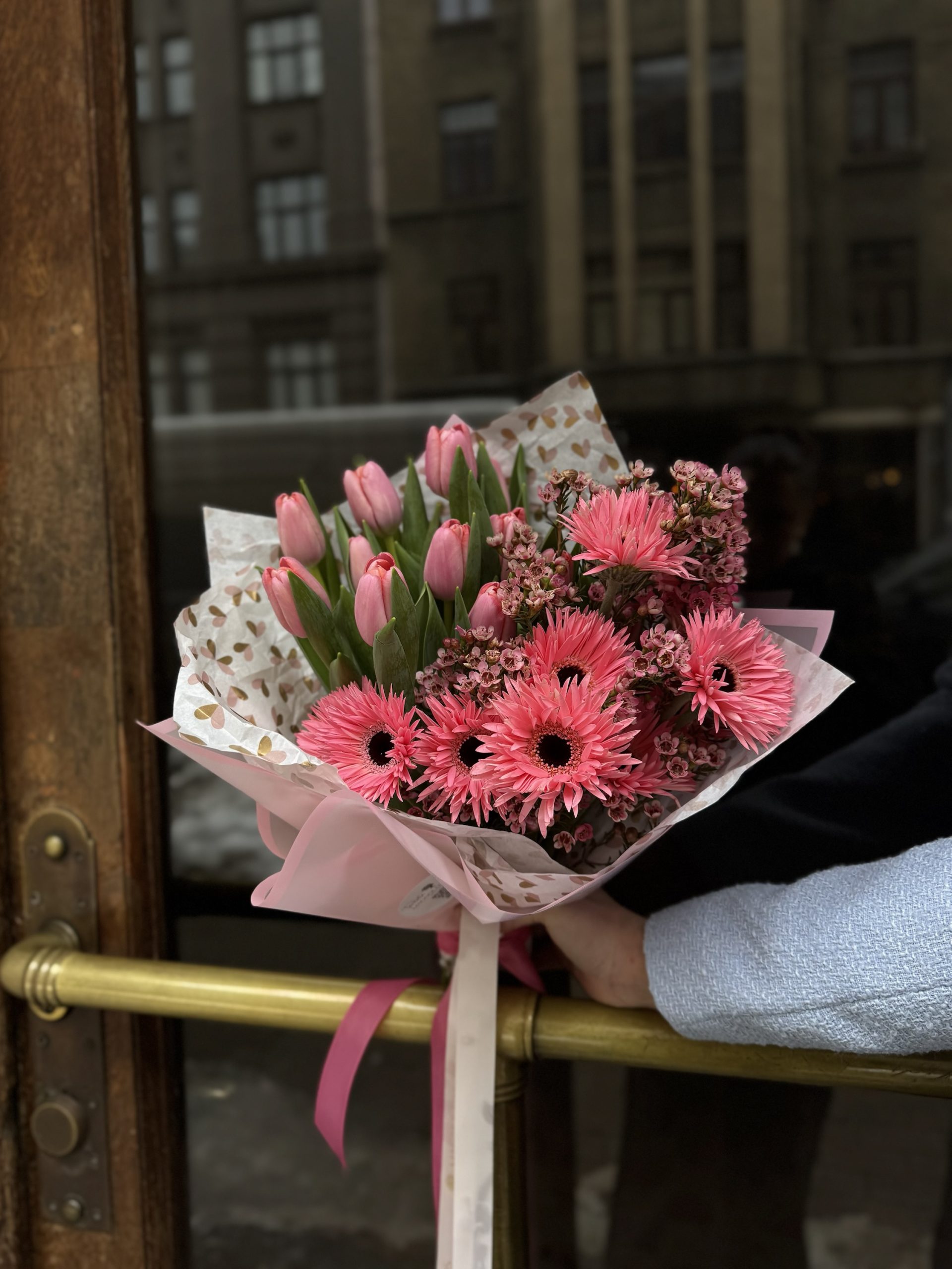 Košs un svinīgs ziedu salikums ar romantisku noskaņu. Radīts, lai 8. martā uzdāvinātu prieku un smaidu.